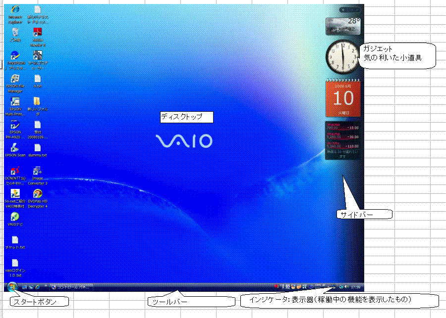 机の上という意味で、パソコンの最初にひらかれた画面です。良く使うソフトのショートカットとかメーモとかを貼り付けたりすることができます。
